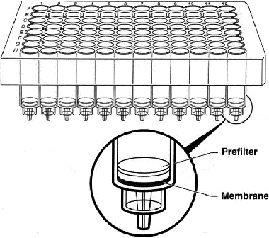 Figure. Multiwell extraction plate. Reproduced from ref. 1 with permission from IUPAC and De Gruyter, Copyright 2016. Note 2: Multiwell plates typically contain 24, 96, or 384 wells with volumes varying from about 0.1 to 10 mL. They are used for parallel sample processing in high throughput applications. |