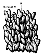 Local symmetry axis for the singlet, orientational distribution of the molecules of a mesophase. Note 1: The director is defined as a unit vector, but directions +n and -n are arbitrary. Note 2: In uniaxial nematics, formed by compounds consisting of either rod-like or disc- like molecules, the mean direction of the effective molecular symmetry axis coincides with the director. Note 3: The director also coincides with a local symmetry axis of any directional property of the mesophase, such as the refractive index or magnetic susceptibility. Fig. A representation of the molecular organization in a uniaxial nematic mesophase. |