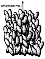 შენიშვნა 1: მიმმართელი წარმოადგენს ერთეულოვან ვექტორს, მაგრამ +n და -n მიმართულებები თვითნებურია. შენიშვნა 2: ცალღერძიან ნემატიკაში, რომელიც წარმოიქმნება ღეროსებრი ან დისკოსებრი მოლეკულებისგან შემდგარი ნაერთებით, ეფექტური მოლეკულური სიმეტრიის ღერძის საშუალო მიმართულება ემთხვევა მიმმართველს. შენიშვნა 3: მიმმართველი ასევე ემთხვევა მეზოფაზის ნებისმიერი მიმართულების თვისების ლოკალურ სიმეტრიის ღერძს, როგორიცაა გარდატეხის ინდექსი ან მაგნიტური მგრძნობელობა. სურ. მოლეკულური ორგანიზაციის წარმოდგენა ცალღერძიან ნემატურ მეზოფაზაში. |