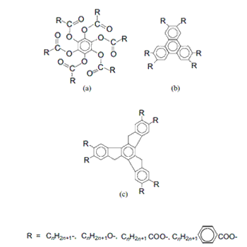 Mesogen composed of relatively flat, disc- or sheet-shaped molecules. Note 1: Examples are: hexakis(acyloxy)benzenes (a), hexakis(acyloxy)- and hexakis(alkoxy)-triphenylenes (b), 5H,10H,15H-diindeno[1,2-a:1´,2´-c]fluorene derivatives (c). Note 2: The adjective “discotic” is also employed to describe the nematic mesophases formed by discotic mesogens. The mesophases formed by a columnar stacking of disc-like molecules are described as columnar mesophases. |