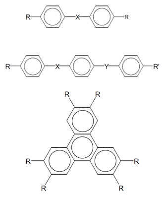Part of a molecule or macromolecule endowed with sufficient anisotropy in both attractive and repulsive forces to contribute strongly to LC mesophase, or, in particular, to LC mesophase formation in low-molar-mass and polymeric substances. Note 1: ‘Mesogenic’ is an adjective that in the present document applies to molecular moieties that are structurally compatible with the formation of LC phases in the molecular system in which they exist. Note 2: Mesogenic groups occur in both low-molar-mass and polymeric compounds. Note 3: The majority of mesogenic groups consist of rigid rod-like or disc-like molecular moieties. Examples Where R and R` are alkyl groups and X and Y are divalent linking units such as: |