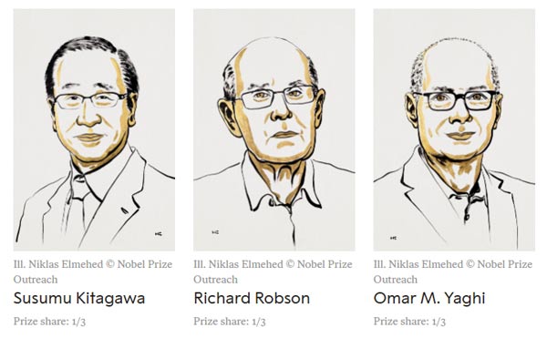 2025 წელს ქიმიის დარგში ქიმიის დარგში ნობელის პრემიის ლაურეატები გახდნენ სუსუმუ კიტაგავა (კიოტოს უნივერსიტეტი, იაპონია), რიჩარდ რობსონი (მელბურნის უნივერსიტეტი, ავსტრალია) და ომარ იაგი (კალიფორნიის უნივერსიტეტი, ბერკლი, აშშ) მოლეკულური არქიტექტურის ახალი ფორმის შემუშავებაში შეტანილი წვლილისთვის. მათ მიერ შემოთავაზებულ მოლეკულურ სტრუქტურებში ლითონის იონები „ქვაკუთხედების“ ფუნქციას ასრულებენ, რომლებიც ერთმანეთთან გრძელი ორგანული მოლეკულებით უკავშირდებიან და წარმოქმნიან დიდი ზომის ღრუების (ფორების) შემცველ ორგანიზებულ სტრუქტურებს - კრისტალებს. ასეთი ტიპის მასალები ლითონ-ორგანული ჩარჩოების (MOF) სახელით არის ცნობილი. MOF-ებში გამოყენებული საშენი ბლოკების ცვლილებით შესაძლებელია მიზანმიმართული თვისებების მასალების მიღება (მაგალითად, კონკრეტული ნივთიერებების შთანთქმისთვის და/ან აკუმულირებისთვის). MOF-ებს ასევე შეუძლიათ ქიმიური რეაქციების წარმართვა (კატალიზი) და ელექტროენერგიის გატარება.