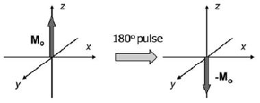 ბმრ სპექტროსკოპიაში იმპულსური რადიოსიხშირული სიგნალი, რომელიც ბირთვული ბრუნვის მოცულობითი დამაგნიტებულობის ვექტორს (M0) საპირისპირო მიმართულებით აბრუნებს, რითაც ეფექტურად ინვერსირდება სიგნალი და (მაგ., +z ღერძიდან -z ღერძზე). როგორც ნახაზზეა მოცემული. ნახ.180° იმპულსი. გადმობეჭდილია John Wiley and Sons-ის ნებართვით, Copyright 2011. |
