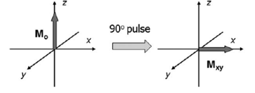 ბმრ სპექტროსკოპიაში პულსირებული რადიოსიხშირული სიგნალი, რომელიც ბირთვული სპინის მოცულობითი დამაგნიტებულობის ვექტორს (M0) მის ორთოგონალურ სიბრტყემდე აბრუნებს. შენიშვნა: მარტივ ერთგანზომილებიან ბმრ ექსპერიმენტში ეს არის მობრუნება z ღერძიდან xy სიბრტყემდე, როგორც ნახაზზეა ნაჩვენები. ნახ. 90° იმპულსი. გადმობეჭდილია John Wiley and Sons-ის ნებართვით, © 2011. |