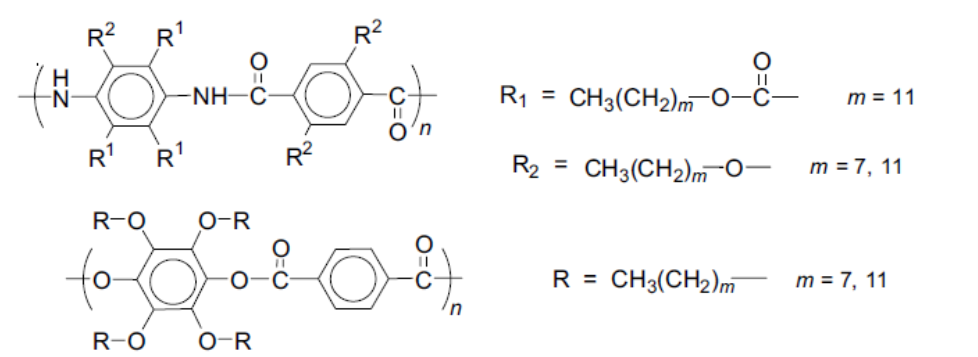 Polymer chain composed of a rigid backbone to which many lateral side-groups are attached, giving the repeating unit a board-like shape. Note 1: The rigid backbone often has a polyester, polyamide or poly(ester-amide) type of structure. Examples are: Note 2: A polymer LC consisting of macromolecules of board-like shape can be called a board-shaped polymer LC. Such polymers can form sanidic mesophases. |
