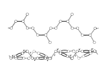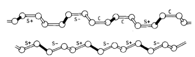 Fig. Chain conformation of the disordered (above) and ordered (below) polymorphs of trans-1,4-polybutadiene (poly[(E)-but-1-ene-1,4-diyl]) in the crystalline state. The heavy black lines designate the double bonds and the symbols S+, S- and C the conformation.