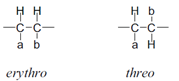 Relative configurations at two contiguous carbon atoms in main chains bearing, respect- ively, substituents a and b (a ≠ b), are designated by the prefix erythro or threo, as appropriate, by analogy with the terminology for carbohydrate systems in which the substituents are –OH.