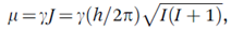 ნუკლიდის მაგნიტური მომენტი μ გაყოფილი მისი სპინის კუთხურ იმპულსზე J. სადაც I არის ნუკლიდის სპინური კვანტური რიცხვი, ხოლო h - პლანკის მუდმივა. შენიშვნა 1: γ შეიძლება იყოს დადებითი (მაგ., 1H, 13C) ან უარყოფითი (15N, 29Si). მაგნიტური ინდუქციის B0 და მაგნიტური კვანტური რიცხვის m კონკრეტული მნიშვნელობებისთვის, γ განსაზღვრავს ბირთვის ენერგიის დონეს. E= - mγ(h/2π) B0 შენიშვნა 2: SI ერთეული: რად წმ-1 ტლ-1 = კულ კგ-1 |