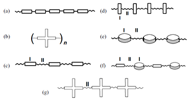 Polymer containing mesogenic units in their main chains but not in side-chains. Note 1: A MCPLC is formed by linking together suitable relatively rigid units directly or through appropriate functional groups (see Fig.). Note 2: The linkage between the rigid units (I) may be (a) direct or (b-g) via flexible spacers (II). Note 3: A MCPLC with cross-shaped mesogenic groups (b or g) is known as a cruciform (or star) polymer liquid crystal. Note 4: The rigid units may, but often do not, possess intrinsic mesogenic character. Fig. Examples of main-chain polymer liquid crystals: I - mesogenic group; II - spacer. |