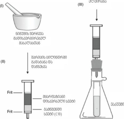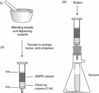 ნახ. მყარფაზიანი მატრიცის დისპერსიის ტიპური სამუშაო სქემა. (i) ნიმუშის შერევა აბრაზიულ სორბენტთან; (ii) ნიმუშის შემცველი თავისუფლად დინებადი ფხვნილის გადატანა მოკლე სვეტში; (iii) სამიზნე ანალიტების მიღება ელუირებით. გადმობეჭდილია წყაროდან [36] Elsevier-ის ნებართვით, © 2010 |