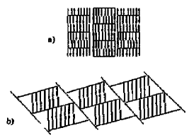 Smectic mesophase that has a periodic in-plane density variation. Note 1: The recommended mark to designate a modulated smectic mesophase is a superior tilde (~). Note 2: See Figs (a) and (b) for illustrations of the molecular arrangements in SmSmà and SmC̃ mesophases. Fig. Schematic drawing of the modulated smectic mesophases (a) Smà and (b) SmC̃. Note 3: The Smà mesophase is also known as a centered rectangular mesophase or anti-mesophase. The dimensional space group is cmm in the International System. Note 4: The SmC̃ mesophase is also known as an oblique or ribbon mesophase. The dimensional space group is pmg in the International System. |