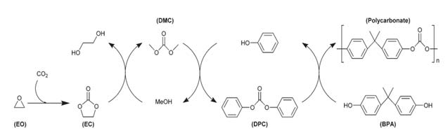 ზოგადად, პოლიკარბონატების სინთეზი მიმდინარეობს, მომწამლავი ნივთიერების, ფოსგენის თანხლებით, ამ მეთოდის უპირატესობა კი ის არის, რომ ფოსგენს არ იყენებენ და ამოვდროულად, ხდება ნახშირორჟანგის უტილიზაცია რეაქციის დროს.