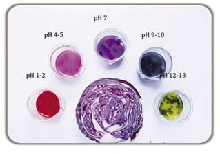 აიღეთ წითელი კომბოსტოს 100 გრამი, დაჭერით წვრილად, მოათავსეთ მომინანქრებულ 800 მლ-იან ქვაბში, დაამატეთ 400 მლ წყალი, მოათავსეთ ელექტროქურაზე ან გაზქურაზე და ადუღეთ 20 წუთი (ხსნარი უნდა იყოს მუქი იისფერი). შემდგომ ჭურჭელი ფრთხილად გადმოდგით ქურიდან (გამოიყენეთ რაიმე ნაჭერი), გააცივეთ და დეკანტაციით (გადაწურვით) მოაშორეთ მყარი მასა. პარალელურად მოამზადეთ 9 ცალი პატარა, 100 მლ-იანი ჭიქები და თითოეულ ჭიქას გაუკეთეთ წარწერები ჩამოთვლილი ხსნარების შესაბამისად: